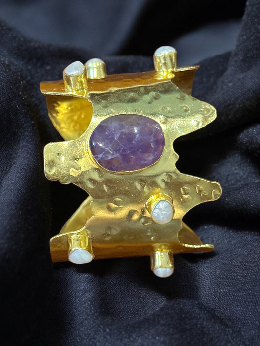 Natural Stone Panch Lazer Cut Brass Cuff Adjustable