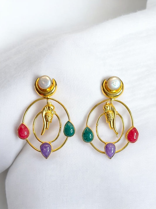Totapari Stone Pearl Statement Dangler Brass Earrings