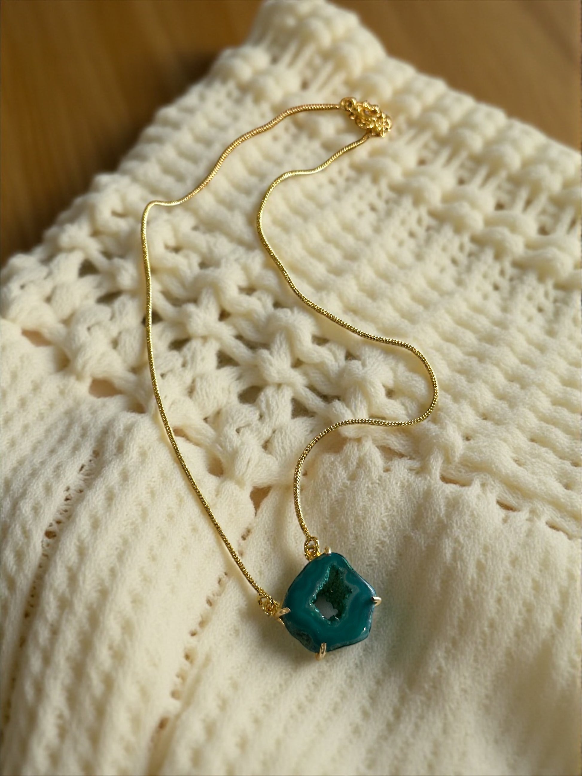 Druzy Agate Pendant Necklace crafted from a natural druzy stone that celebrates raw beauty and organic form. Featuring a vivid coloured agate slice with a naturally formed crystal centre.