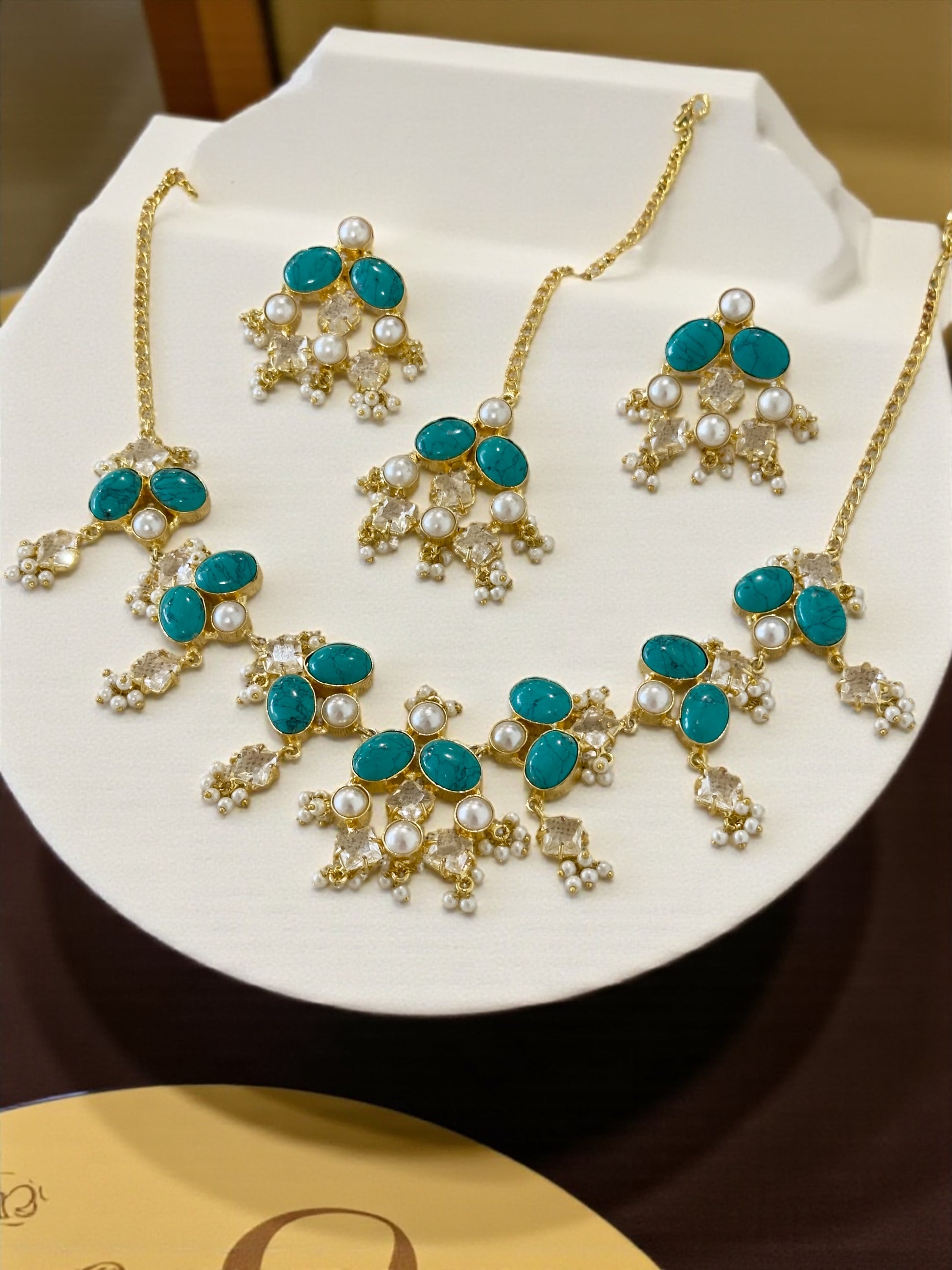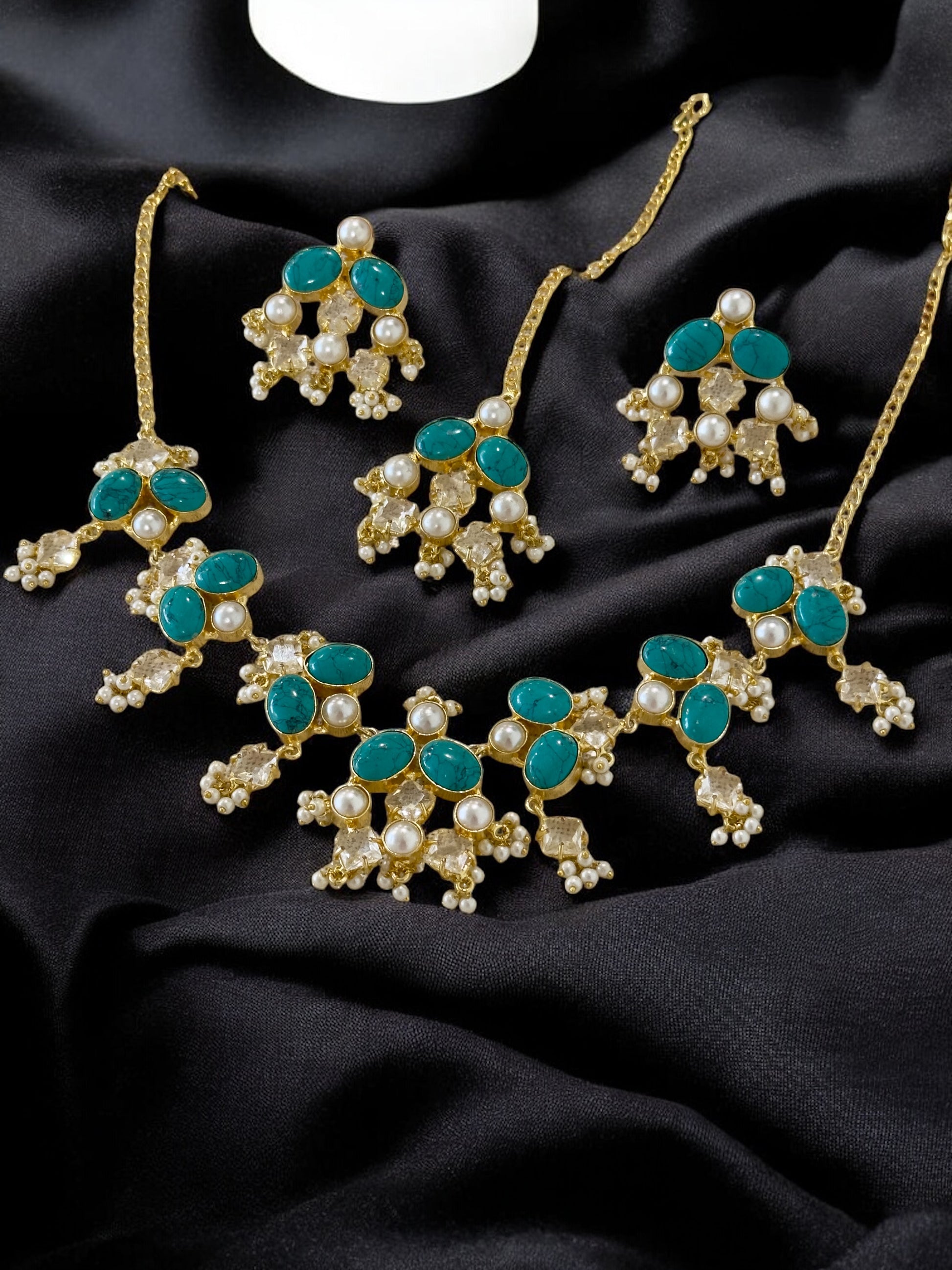 This Turquoise Necklace Set with Maang Tikka features vivid turquoise stones accented with freshwater pearls and crystal drops, all set in radiant gold plating.