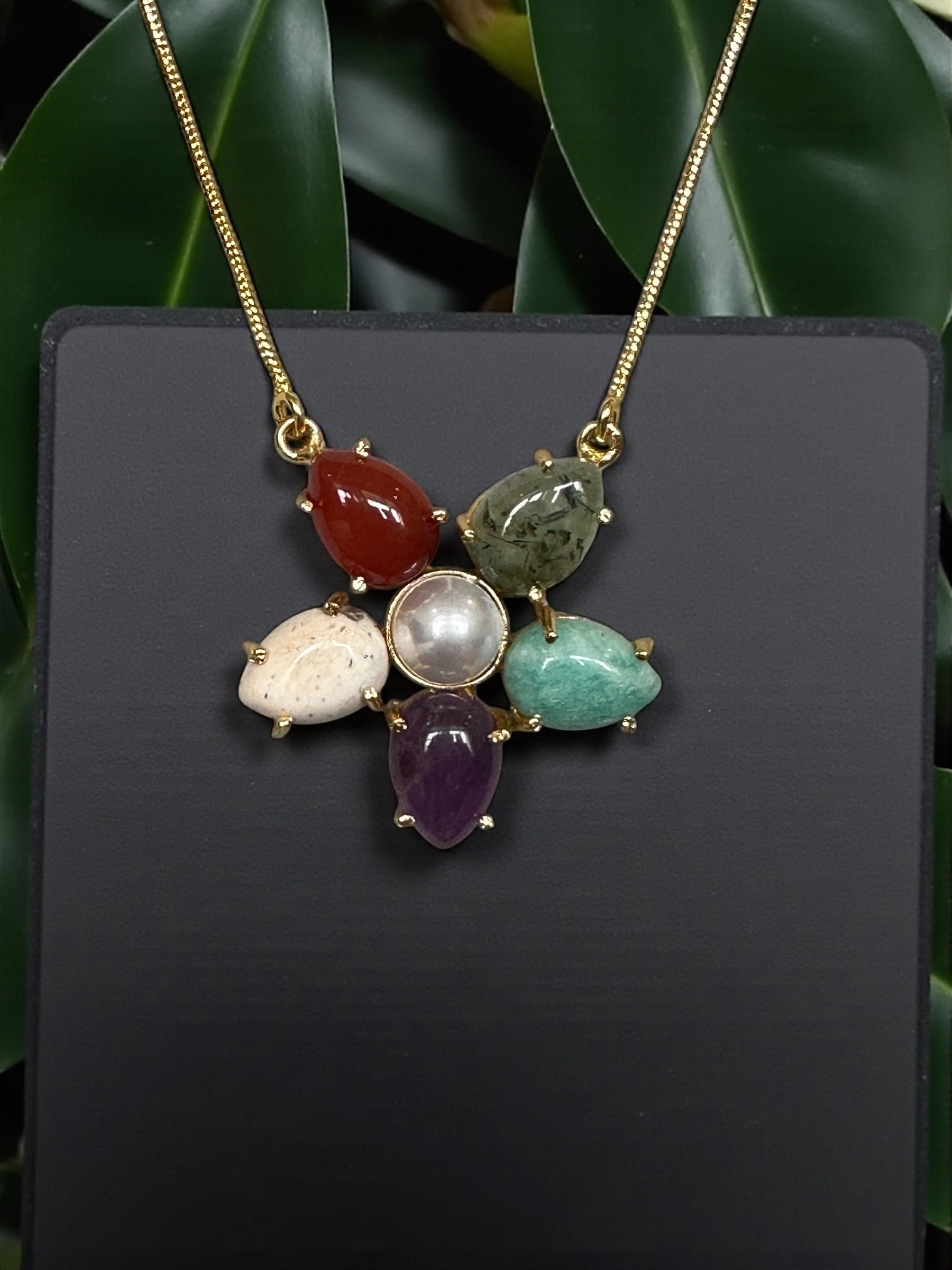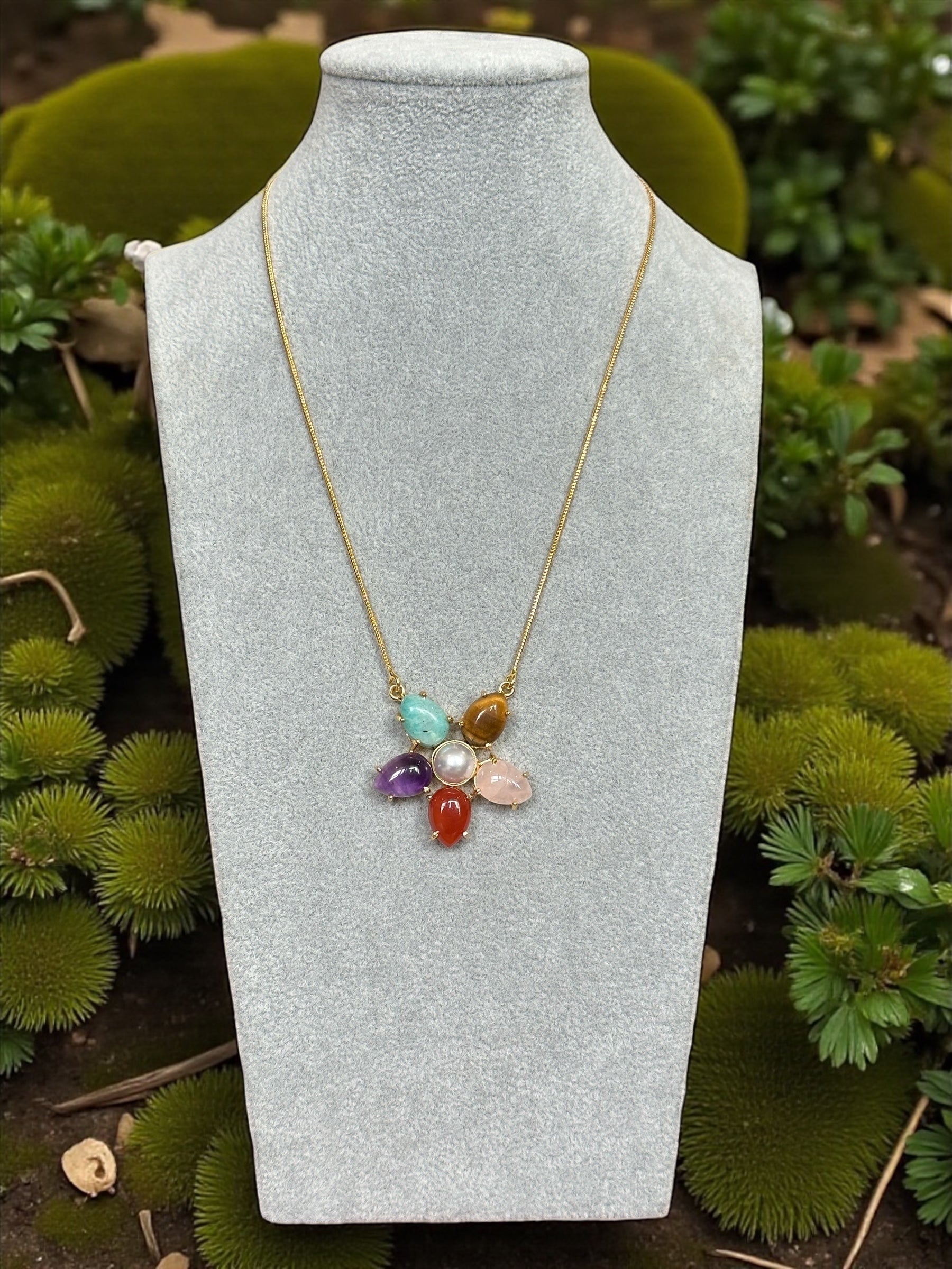 A dreamy boho-chic chain necklace that captures thats playfully fun. This handcrafted statement piece features five polished natural gemstones with a freshwater pearl as centerpiece.