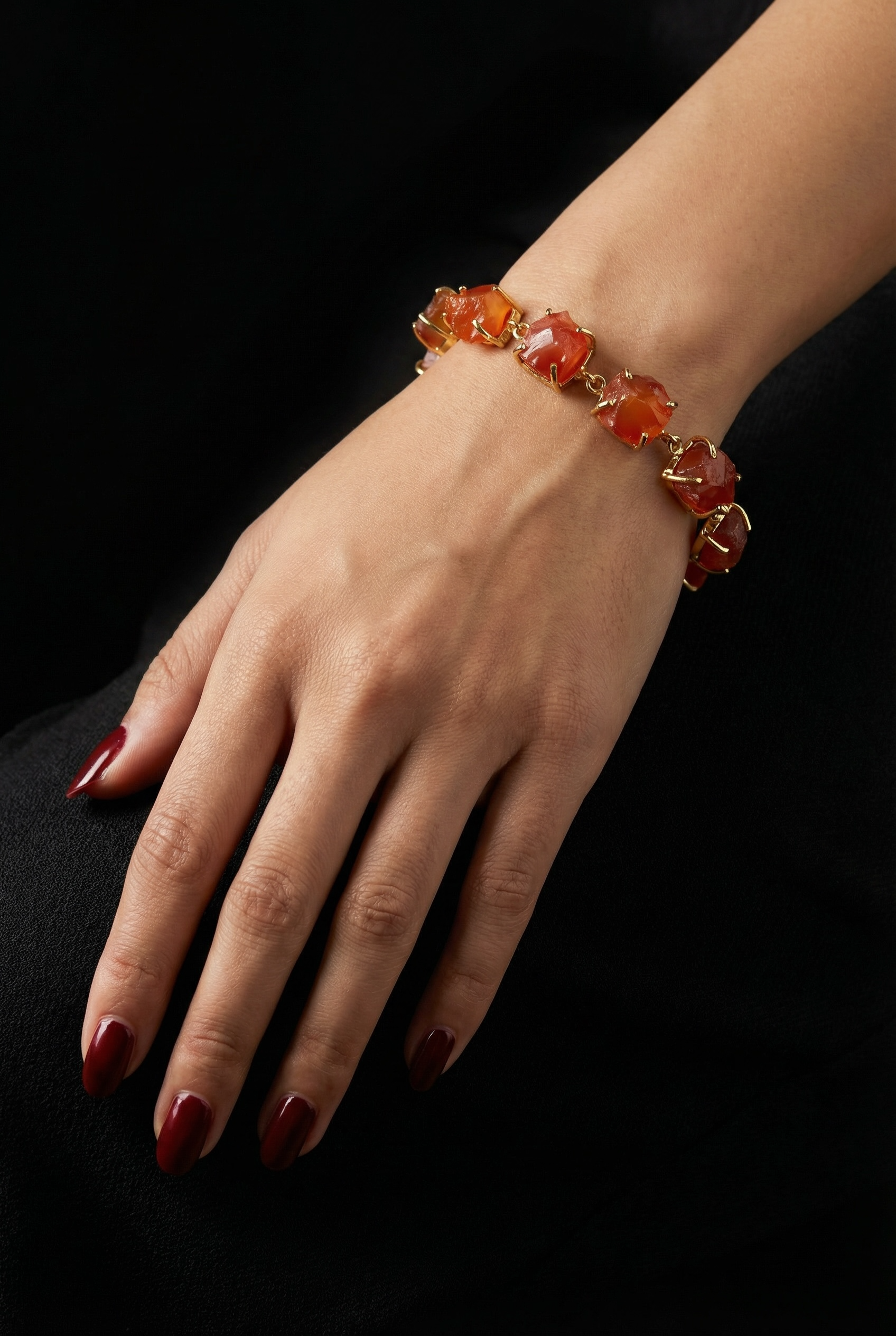 Each bracelet features raw, unpolished carnelian in claw setting in linear design. The adustable clasp ensures a comfortable and adjustable fit for every wrist.
