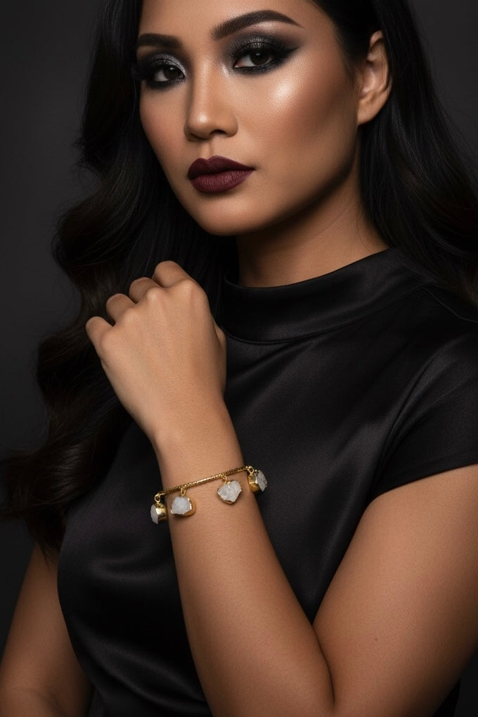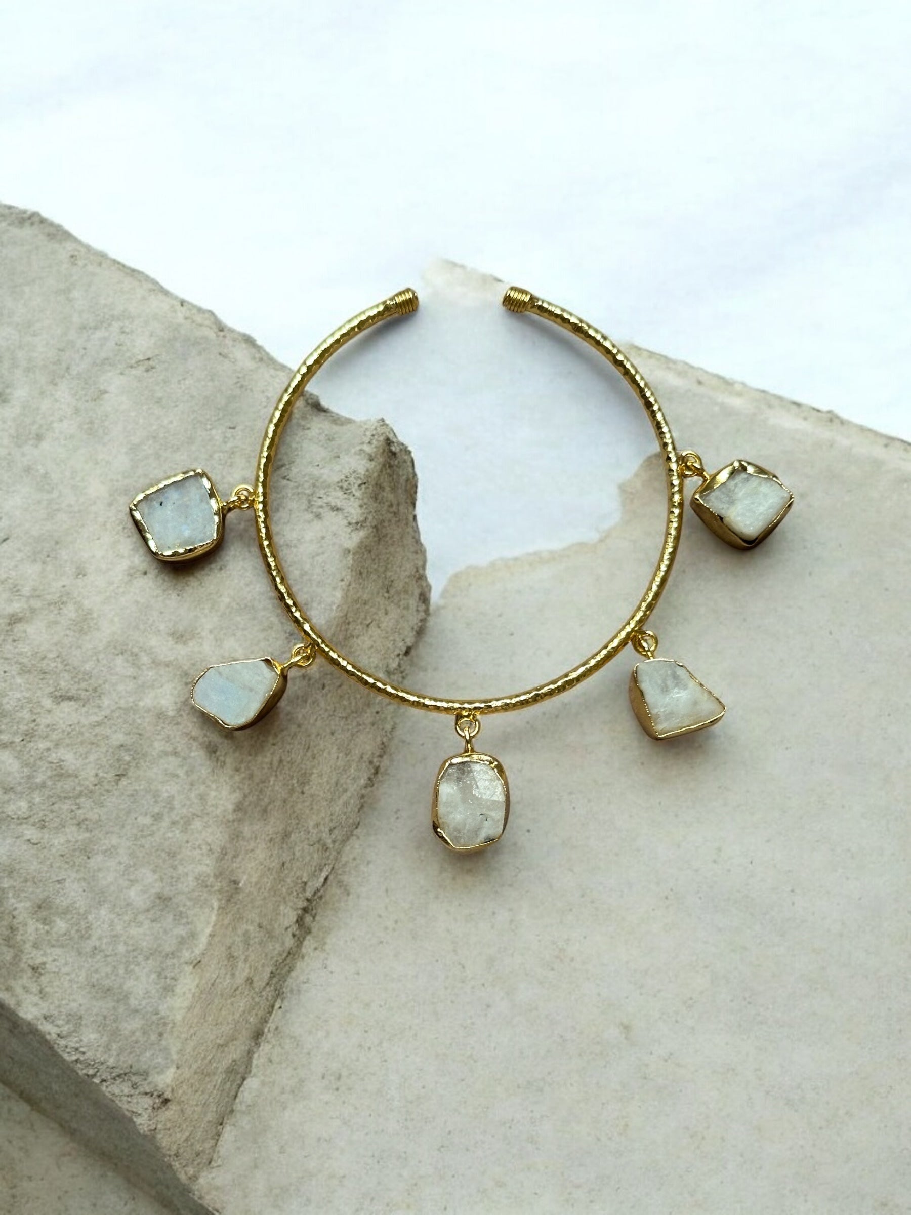 An open bangle adorned with raw Moonstone charms, each stone is a deep, soothing green. Designed for effortless everyday elegance.